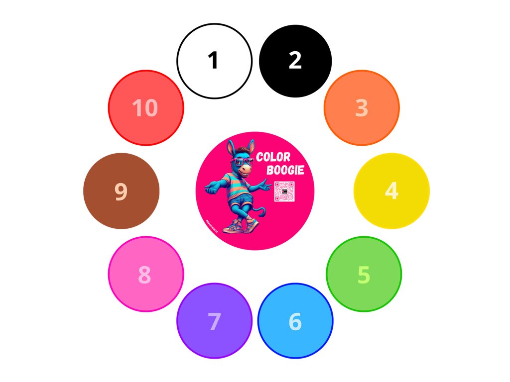 Color Boogie & Flower Dancing jsou interaktivní podlahové hry, které kombinují barvy, čísla a pohyb do jednoho zábavného vzdělávacího celku. Ve středu samolepky stojí hráč na velkém kole, kolem kterého je rozmístěno 10 menších koleček s různými barvami a čísly (1–10).
