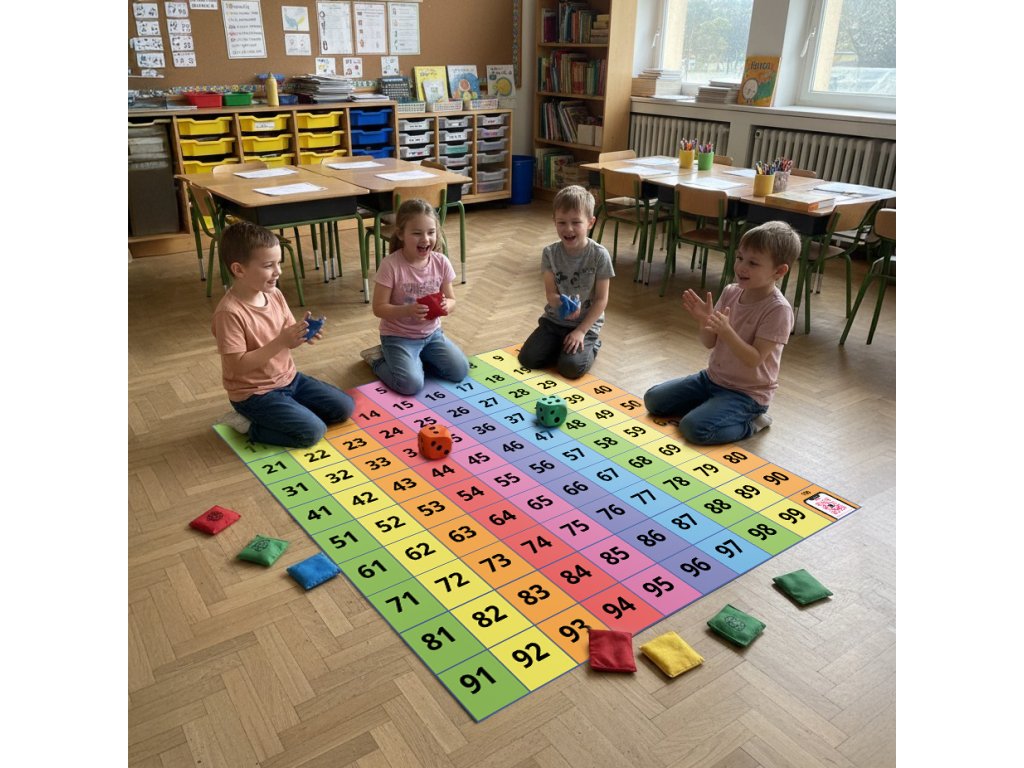 Matematická stovka je interaktivní výuková pomůcka ve formě velké číselné mřížky 10×10 s čísly od 1 do 100. Umožňuje dětem propojit matematiku s pohybem, hrou a spoluprací. Podložka rozvíjí prostorovou orientaci, logické uvažování a podporuje také jazykovou výuku – například v angličtině při práci s čísly, barvami či otázkami.