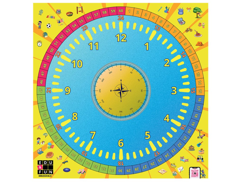 Interaktivní výuková samolepka z vinylu ve tvaru ciferníku, která děti hravou formou učí čas, denní činnosti i prostorovou orientaci. Součástí je metodická příručka s pohybovými hrami a aktivitami pro MŠ, ZŠ a školní družiny.