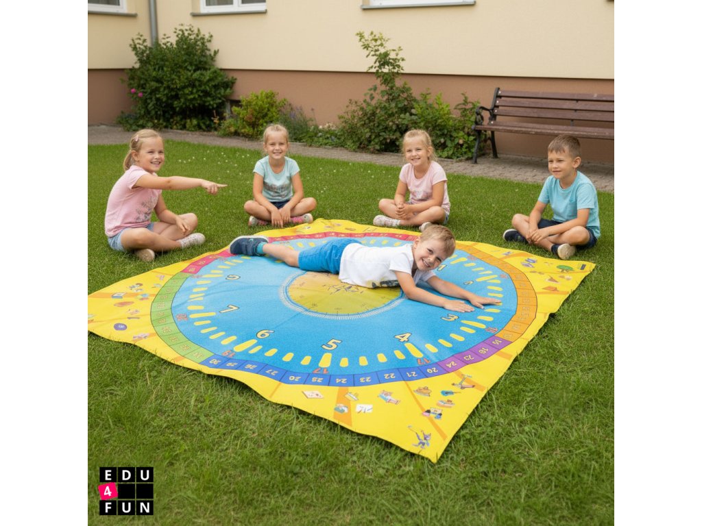 Interaktivní výuková podložka ve tvaru ciferníku, která děti hravou formou učí čas, denní činnosti i prostorovou orientaci. Součástí je metodická příručka s pohybovými hrami a aktivitami pro MŠ, ZŠ a školní družiny.
